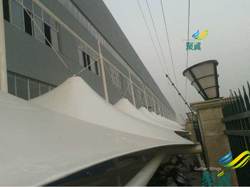 每一種建筑都是時代的像征,代表了這個時代的技術和人們生活的向往,代表了這個時代的精神!膜結構以其輕盈飄逸的造型、柔美并帶有力量的曲線和大跨度和大空間的鮮明個性和標識性,應用于城市小品設計中。自行車棚面料一般選用進口及國產PVC涂層及PVDF PTFE膜材,架采用鋼結構(國標Q235)鋼管一般厚度在:7mm材料制作而成,鋼結構要經過反復加工(切割、打磨、除銹、噴底漆、中間漆、面漆、成品后在做后期處理,從而達到持久不生銹效果),所以車棚款式獨特、新穎、壽命長、美觀、亮麗、時尚。