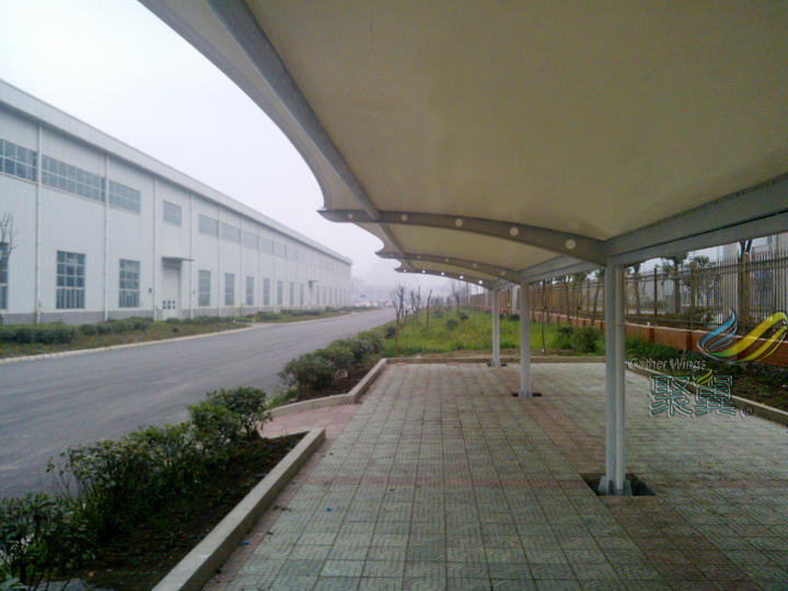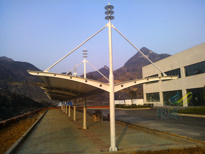 貴州六盤水紅橋新區西南天地煤機裝備制造基地JY30Z膜結構自行車棚案例,制作尺寸:立柱間距6米,兩邊伸展各3米,高4.5米,自行車棚骨架采用Q235熱鍍鋅管材料,膜布面料采用高強張拉性PVDF1100g膜材。因為此面料特性可以讓膜結構自行車棚的表面摩擦力很小,附著的贓物會被雨水自動沖刷干凈,所以不需要清洗仍可保持潔白靚麗。
