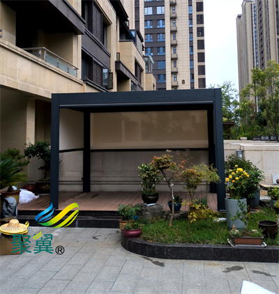 詳細>>3*3鋁合金電動涼亭,頂部鋁百葉及四面防風卷簾都采用電動控制...