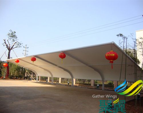彎弧膜結構車棚整體設計考慮:遮陽防雨效果實用價值性,采用流線型設計大氣時尚。是一款具有現代時尚前沿結合的新式遮陽車棚,另外它具有自己獨特的防雨遮陽應用面積更大于普通車棚1.2倍的效果。價格方面考慮到鋼結構的整體用量與普通膜結構車棚相比,此款車棚鋼結構主體采用圓管鋼材大大減少了用鋼量,是一款經濟實用的高端車棚。 彎弧膜結構車棚整體壽命:正常使用情況下8-15年。 彎弧膜結構車棚面料選擇: PVC膜材規格:門幅2.7米、3.0米、3.2米。(每卷長度為100米) 膜材厚度:650g,950g,1100g,1200g,1300g每平方。 透光率為10%-15%,對熱能反射率73%。 其他進口膜材均可選擇:聚翼設計部為您量身訂制最佳方案!