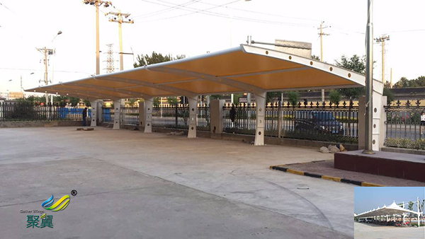 3、膜結(jié)構(gòu)車棚材料組成:鋼結(jié)構(gòu)+膜材料+附件等。