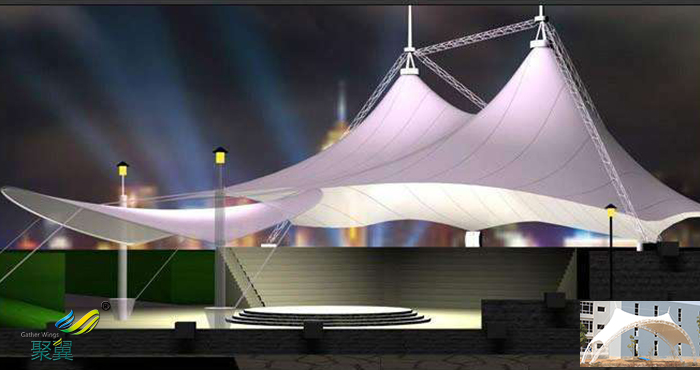 1、舞臺(tái)張拉膜結(jié)構(gòu)的共同曲面外形使其具有激烈的雕塑感,膜面經(jīng)過張力到達(dá)自平衡。