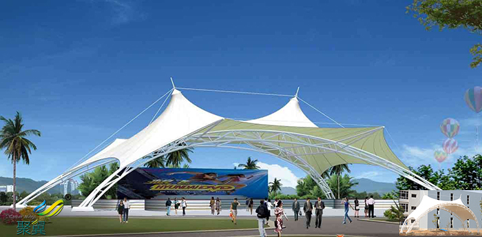 3.舞臺膜結構鋼索膜結構,就是膜布與鋼結構認識的地方,全部都用鋼索來張拉膜布.